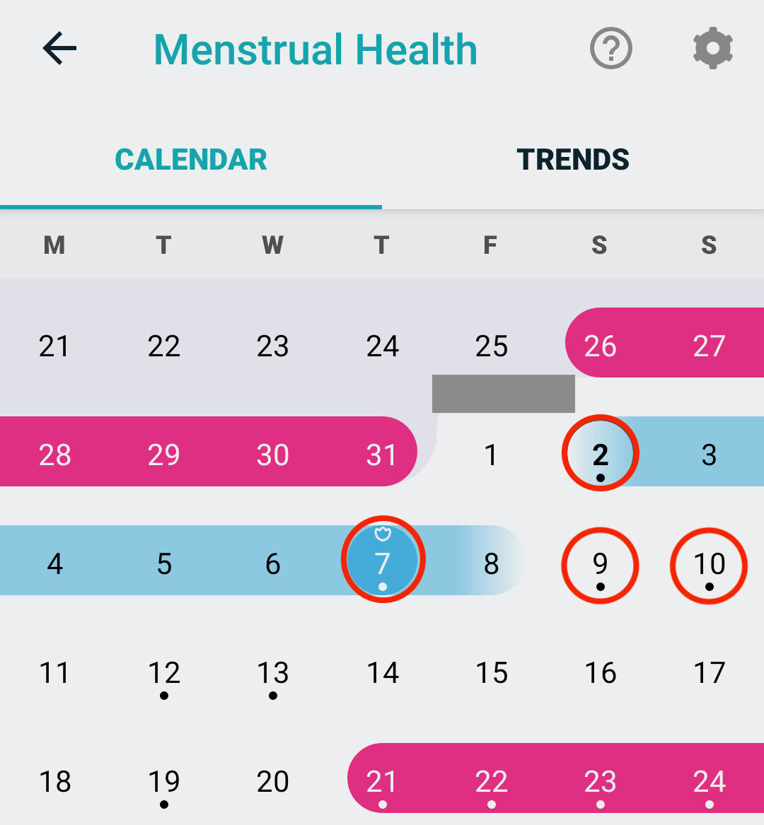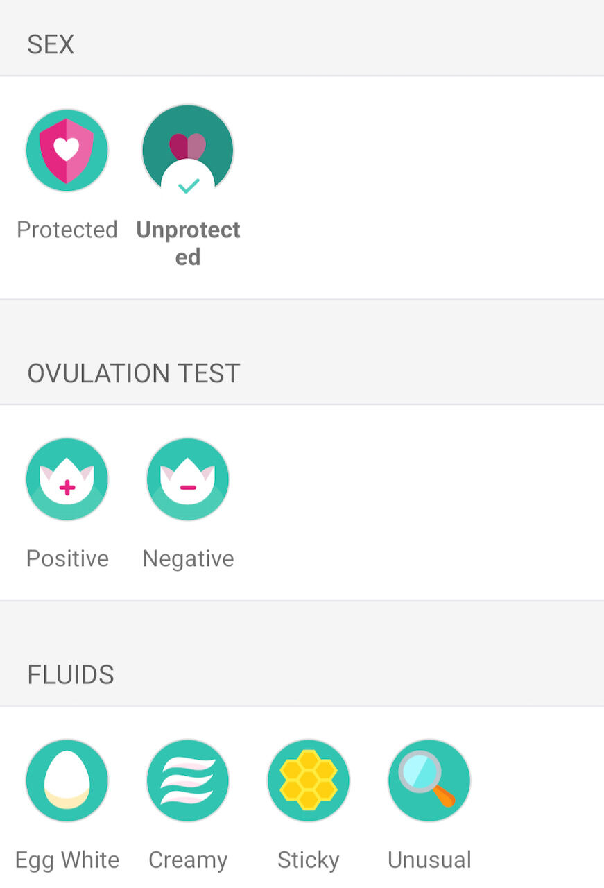 排卵(予定)日はチューリップのマークがあって濃い青の丸の背景になってる日。濃い赤い背景の期間が生理(予定)期間、青い背景の期間が妊娠できる可能性が高い期間。