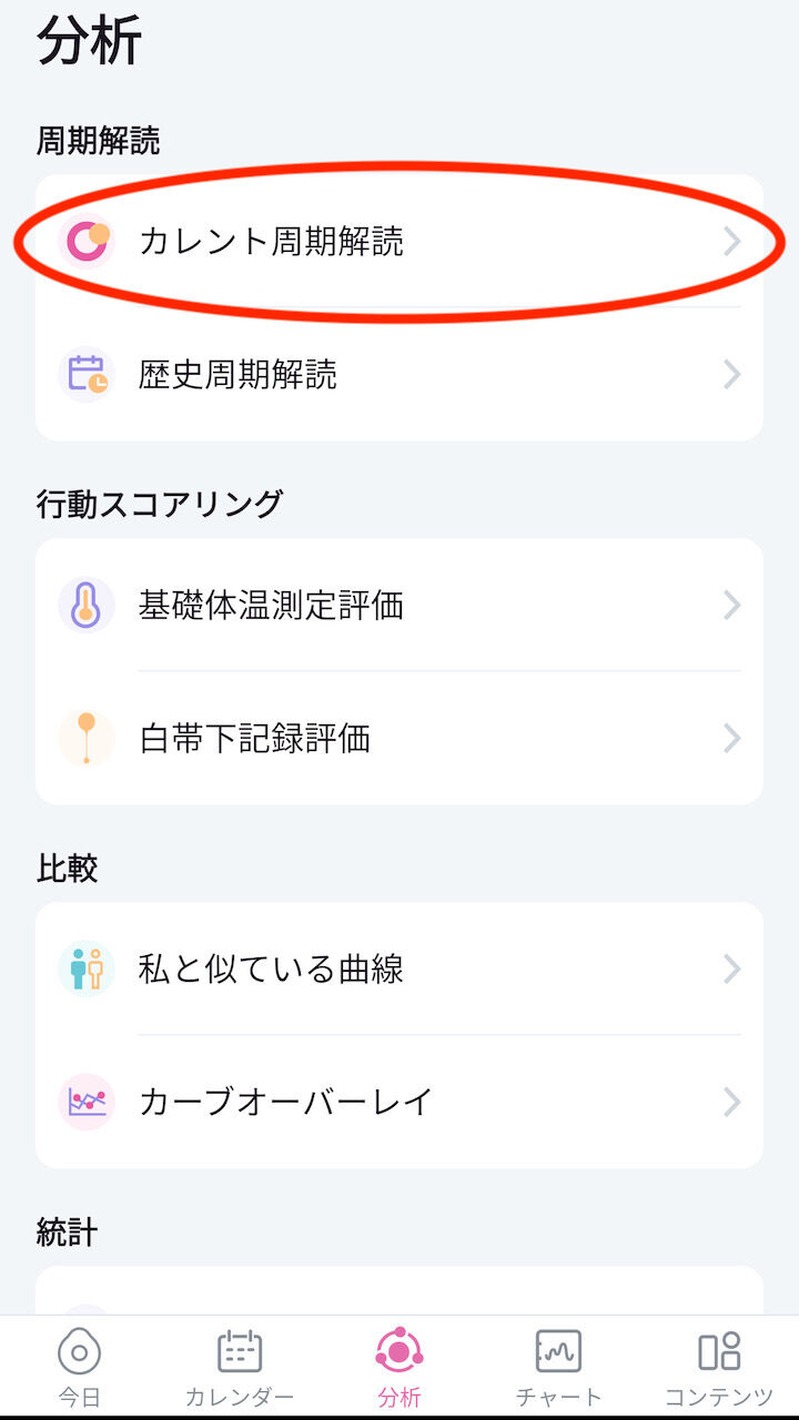 「カレント周期解読(Current Cycle Interpretation)」メニューを見ると、今月(今回の生理サイクルで)いつ