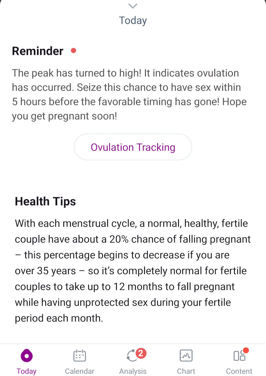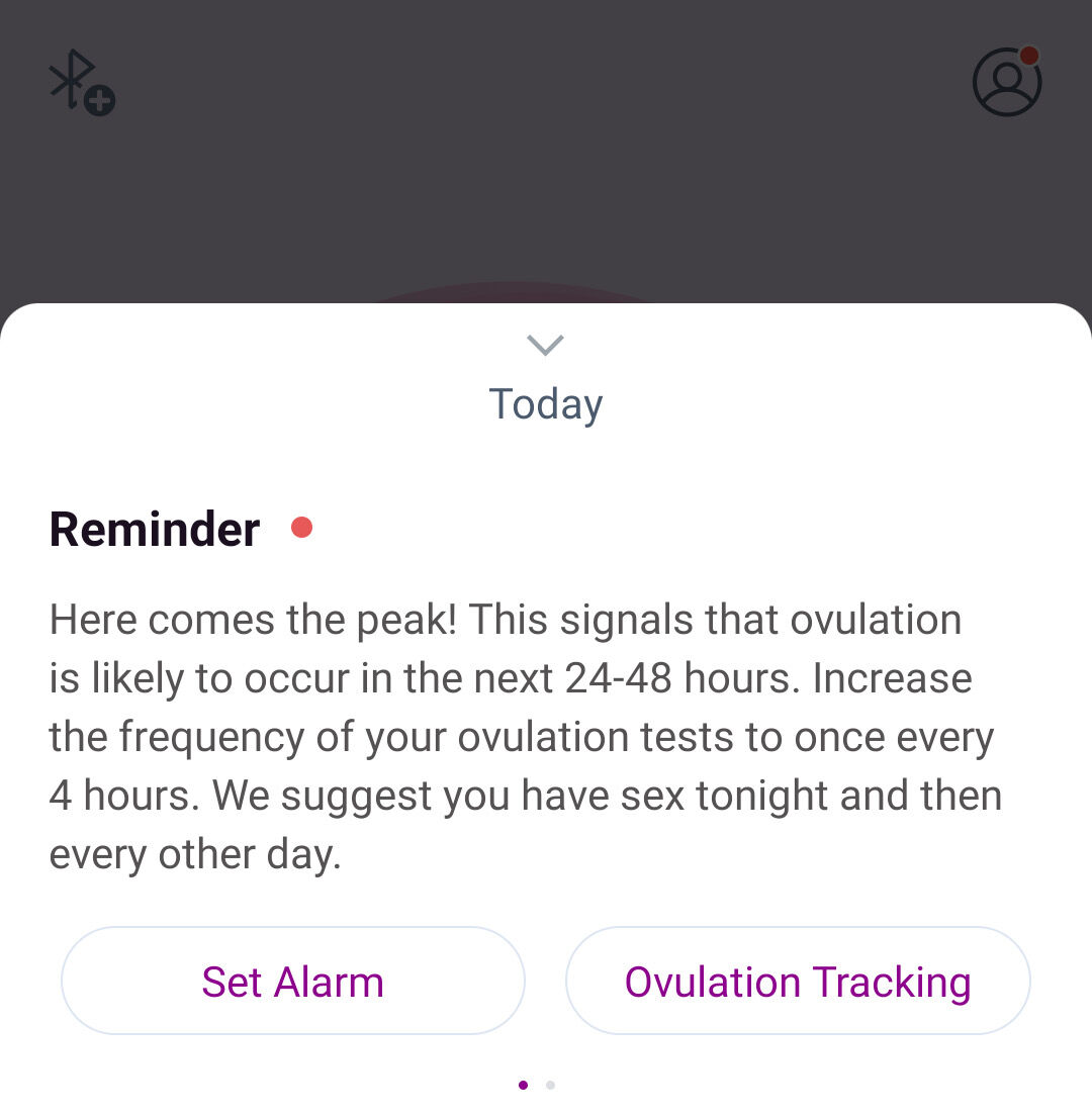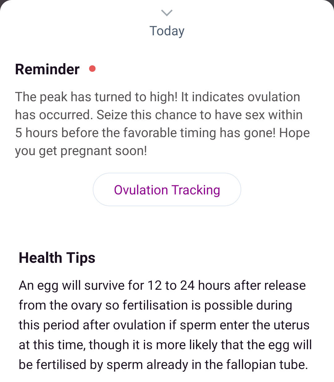 そして、ピークから高いに変わる、もっとも大事な排卵のタイミングのアラートはこんな感じ(英語版)